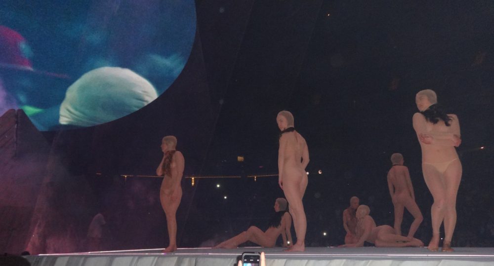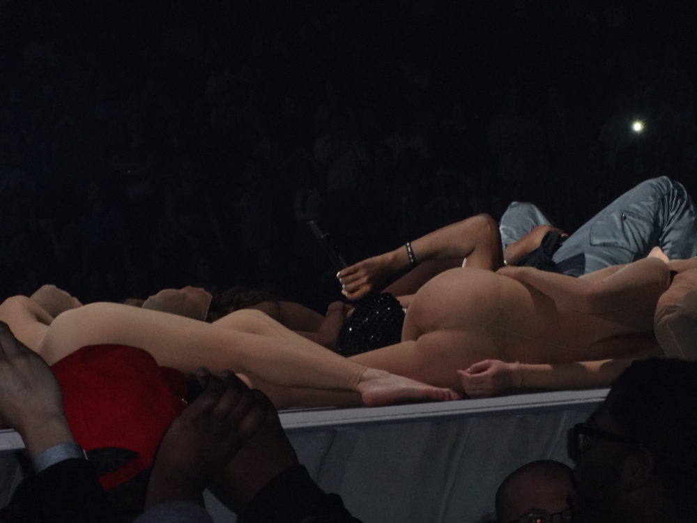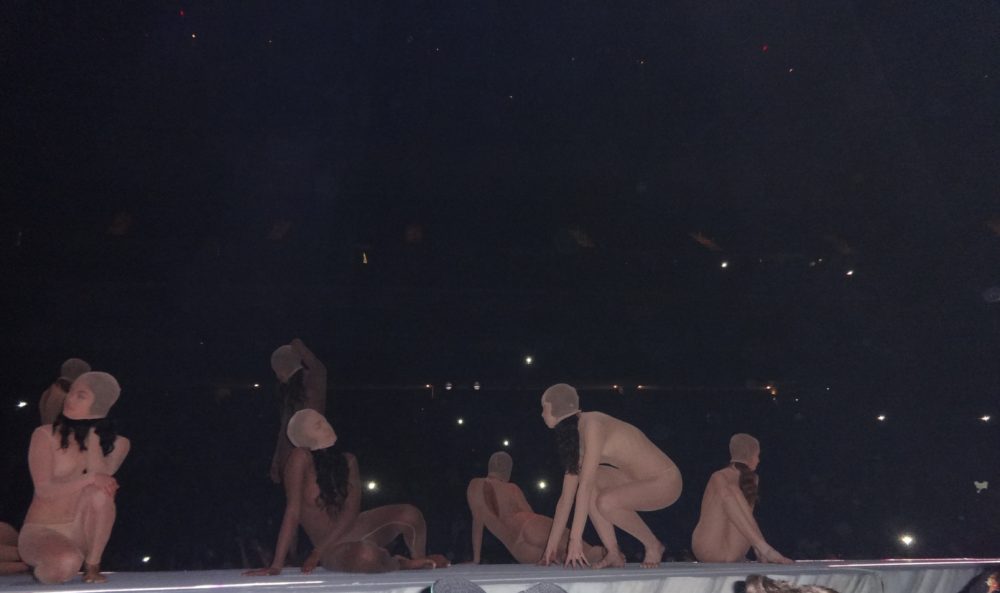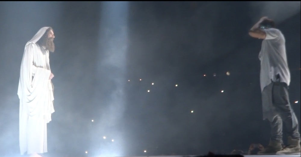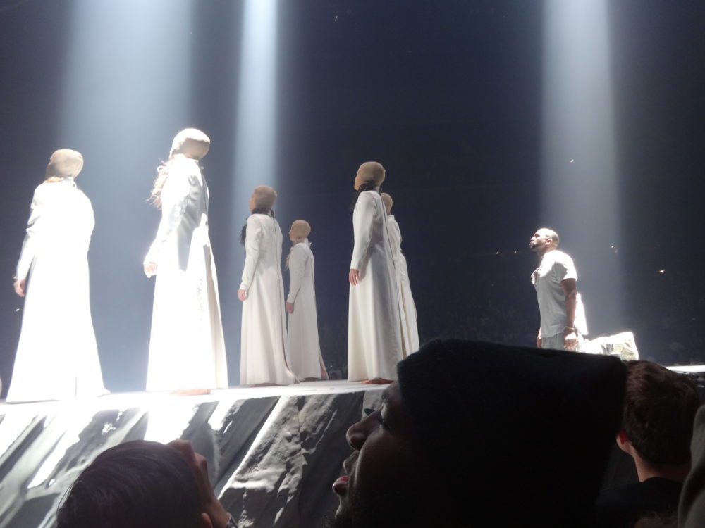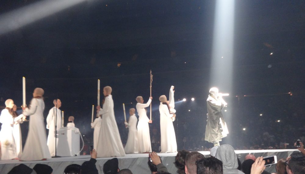 Yeezy performed many of his hits from “College Droput” to “Yeezus”, and his stage-show was impressive; he had giant retractable mountain on stage, a red-eyed ‘wolf’, a choir of dancing angels, and even ‘White Jesus’ came on stage to pray with Kanye before the intro of- you guessed it- “Jesus Walks”. During part of his show ‘Ye was even wearing a ‘iced-out’ mask and trench-coat a la “The Phantom of the Opera”. Of course during the show Kanye went off on one of his infamous ‘rants’, where he addressed everything from his so-called ‘beef’ with Drake, his new deal with Adidas, and he even took time to ‘diss’ Nike, Apple, and the cast of ‘Saturday Night Live’ as well.